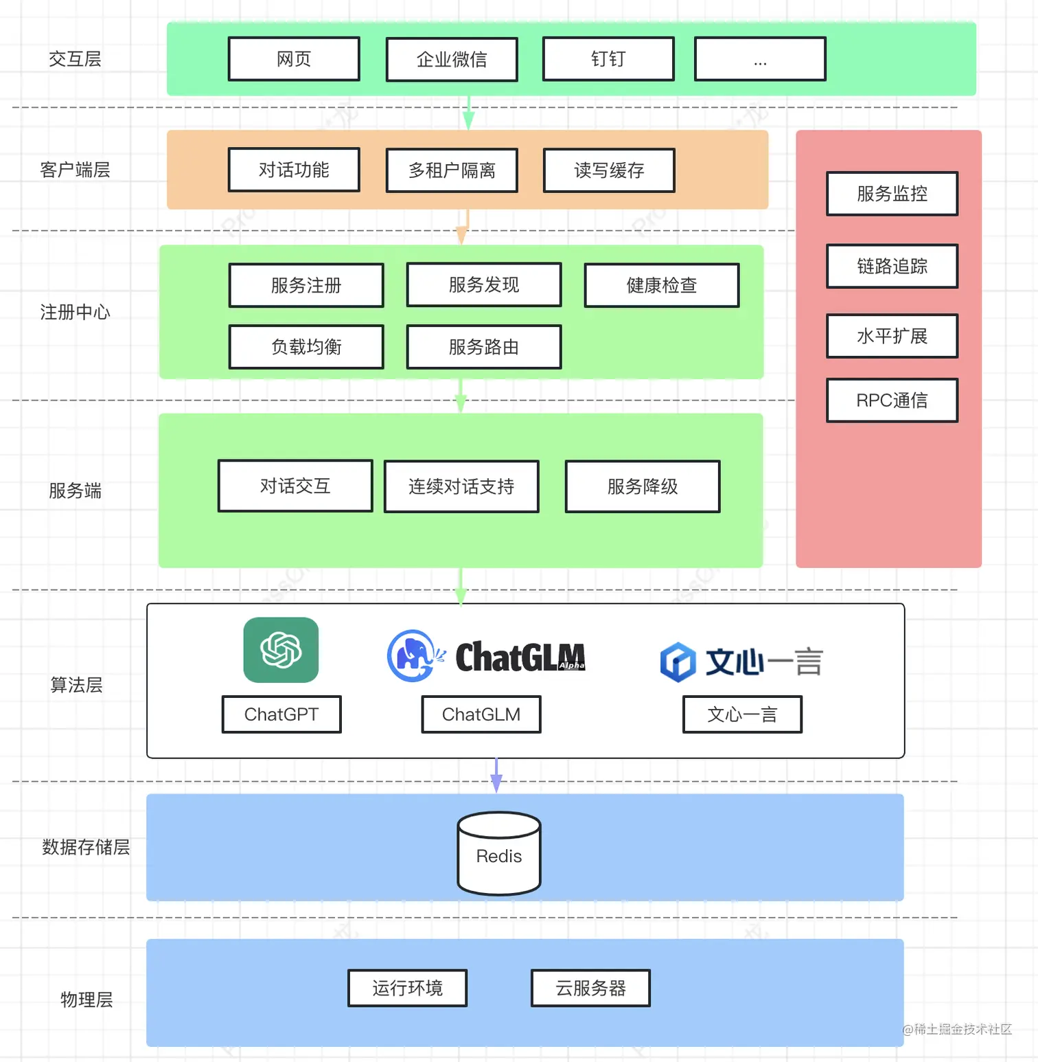 - 服务降级,支持手动降级,在ChatGPT不可用时,能降级到ChatGLM、文心一言等等对话大模型,保证对话功能仍然可用。