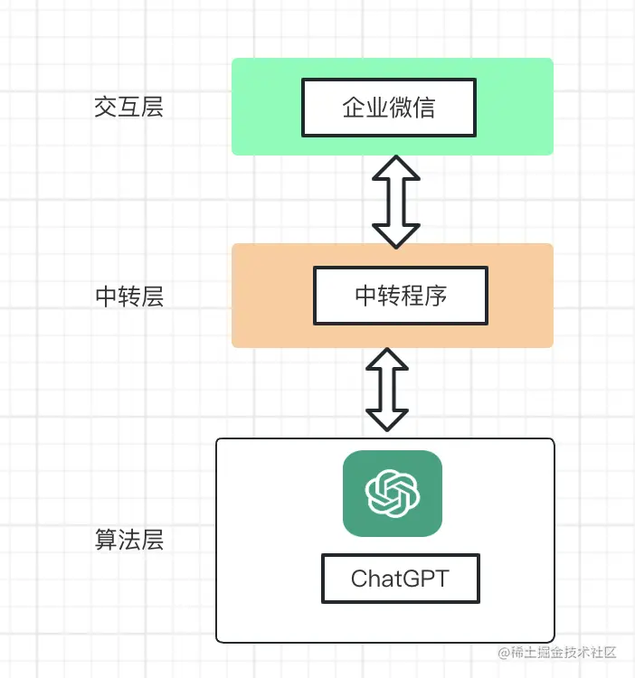 文章结尾说了教程只能适用于小规模使用,网上能找到的其他ChatGPT对接钉钉、飞书、自定义网页等等教程,原理都是一样的,写个中转程序,在ChatGPT和你用的交互工具之间中转一遍。是个简单的单体系统,逻辑看下图
