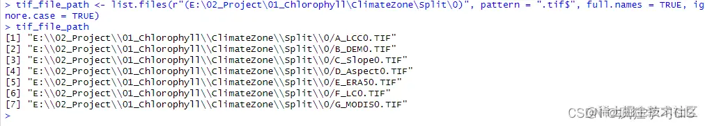 首先,我们需要将存放有大量栅格图像的文件夹明确,并将其带入list.files()函数中;这一函数可以对指定路径下的文件加以遍历。其中,pattern是对文件名称加以匹配,我们用".tif$"表示只筛选出文件名称是以.tif结尾的文件;full.names表示是否将文件的全名(即路径名称加文件名称)返回,ignore.case表示是否不考虑匹配文件名称时的大小写差异。