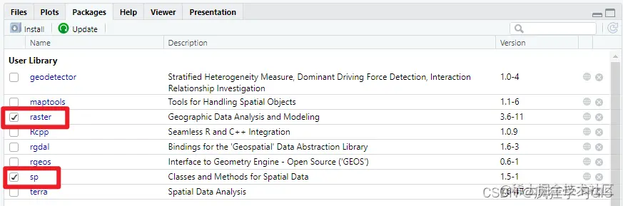 此时,在RStudio右下方的“Packages”中,可以看到raster包以及其所依赖的sp包都处于选中的状态,表明二者都已经配置成功,且完成导入。