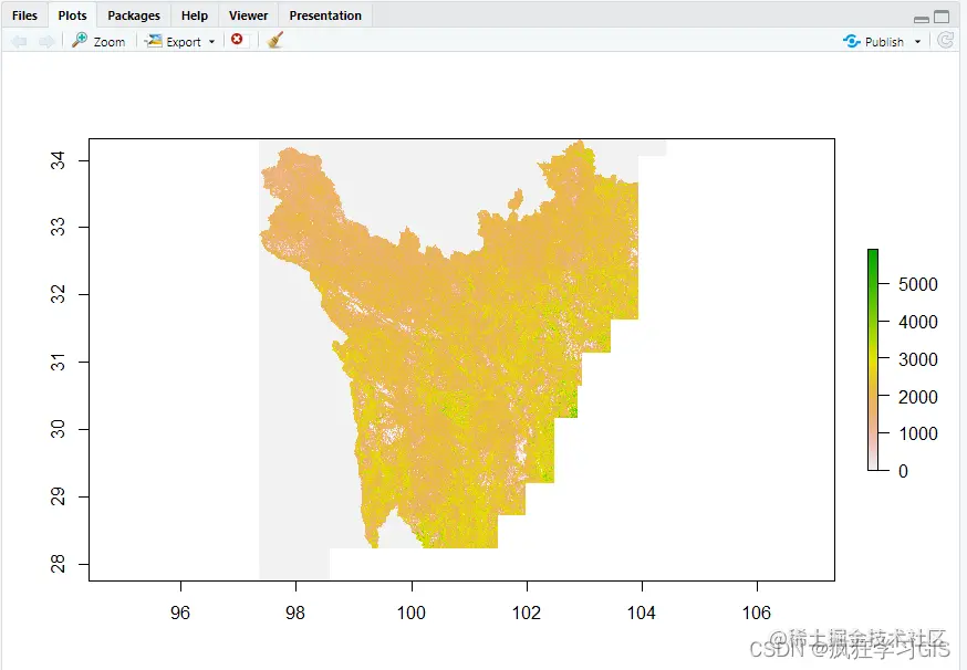 运行代码后,可以在RStudio中右下方的“Plots”看到绘制完毕的图像。可以说,这一绘制栅格图像的方式,相较于Python、**C++**等语言都更为方便。