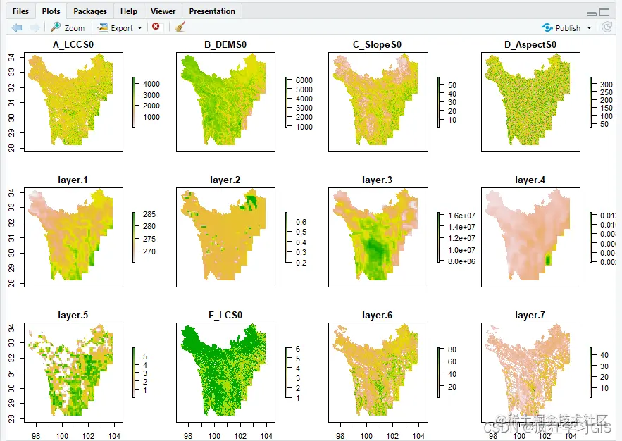 此外,我们还可以继续基于plot()函数,直接批量绘制多个图层各自的栅格图像。