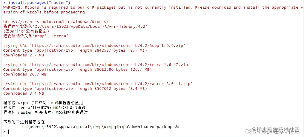 首先,我们输入如下的代码,从而开始raster包的下载与自动配置。