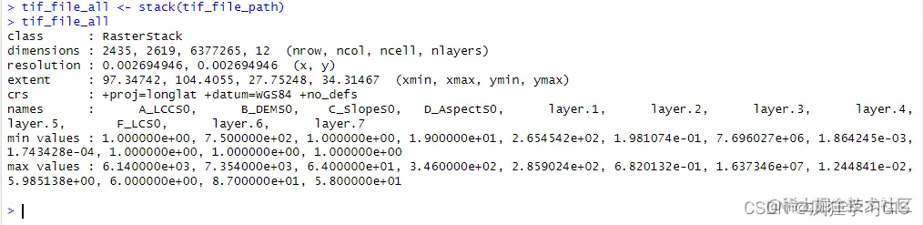 运行上述代码,得到如下所示的结果。可以看到,这一变量中保存了12个图层(虽然栅格图像只有7景,但是其中有几景是具有多个波段的);其中,除了最基本的栅格图像维度、空间范围、空间参考信息等内容,names还展示了12个图层各自的名称,min values与max values则还展示了每一个图层的最小值与最大值。