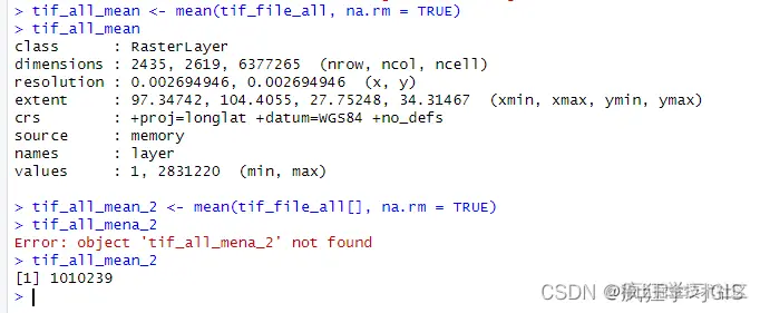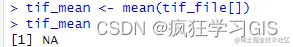 前面我们提到了na.rm = TRUE参数,这一参数表示是否消除数据集中无效值NA的影响;如果我们不将其设置为TRUE,那么就表示不消除数据集中的无效值;而如果我们的栅格图像中出现无效值(NoData值),那么就会使得平均值、标准差等计算结果同样为无效值NA;如下图所示。