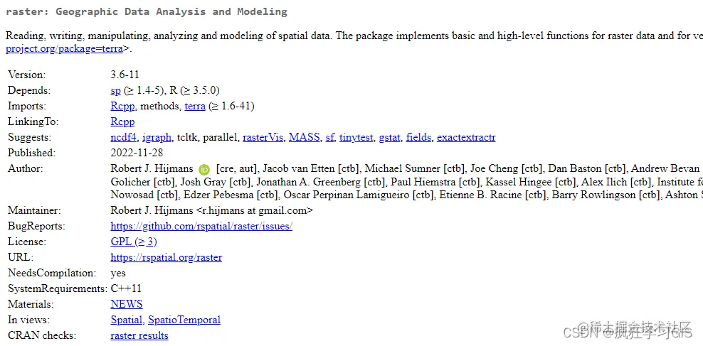 首先,我们需要配置好对应的R语言包;前面也提到,我们这里选择基于raster包来实现栅格图像数据的读取与处理工作。首先,如果有需要的话,我们可以先到raster包在R语言的官方网站中,查阅raster包的基本情况,比如其作者信息、当前的版本、所依赖的其他包等等;如下图所示。