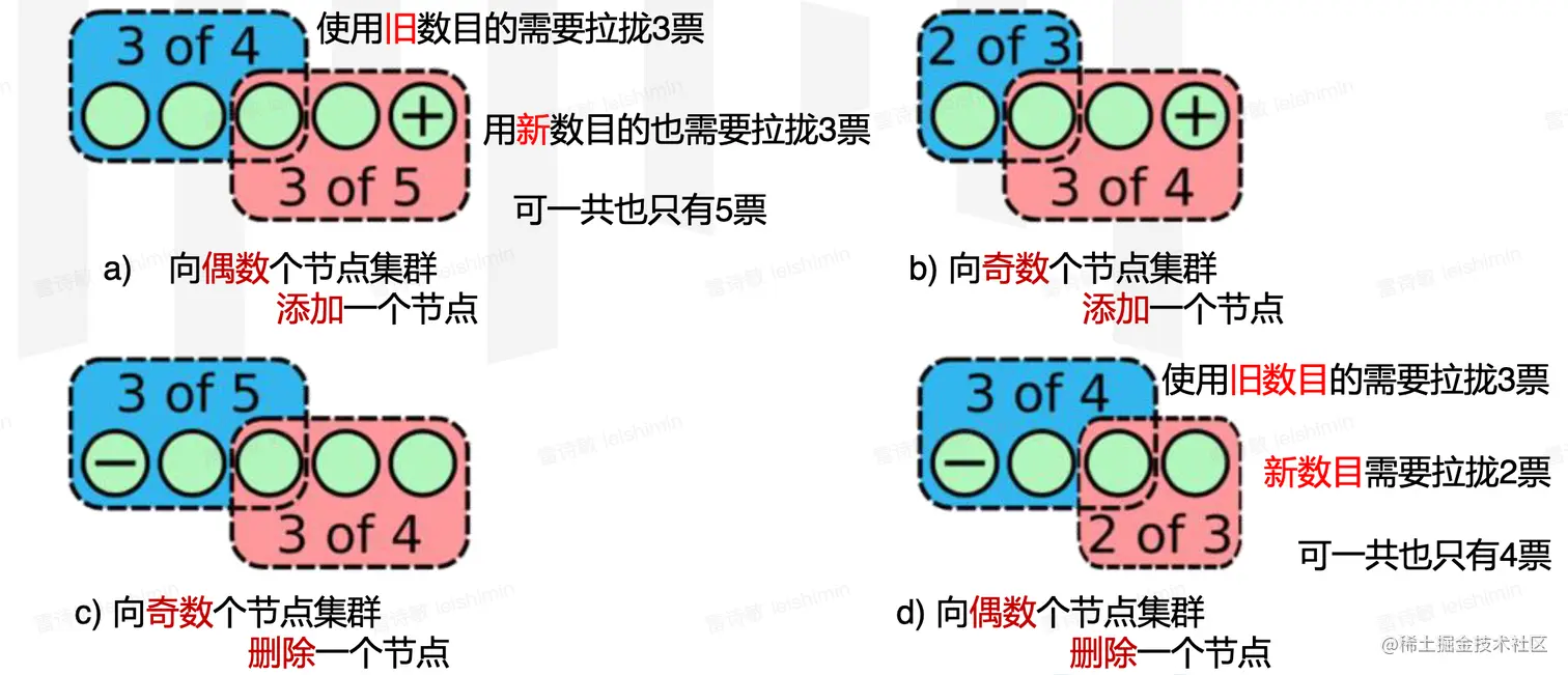 偶数个节点,和比起少一个的奇数个节点相比,可用率是相同的。因此经常是奇数个节点。