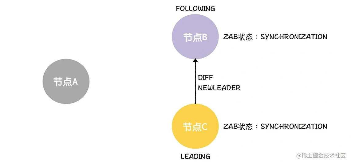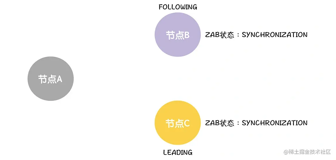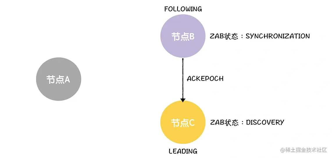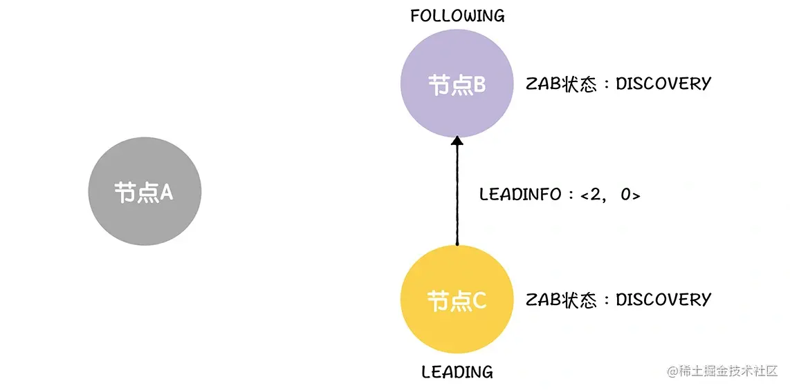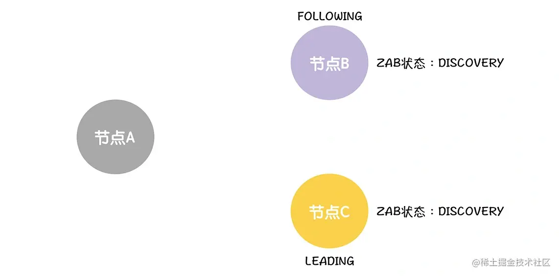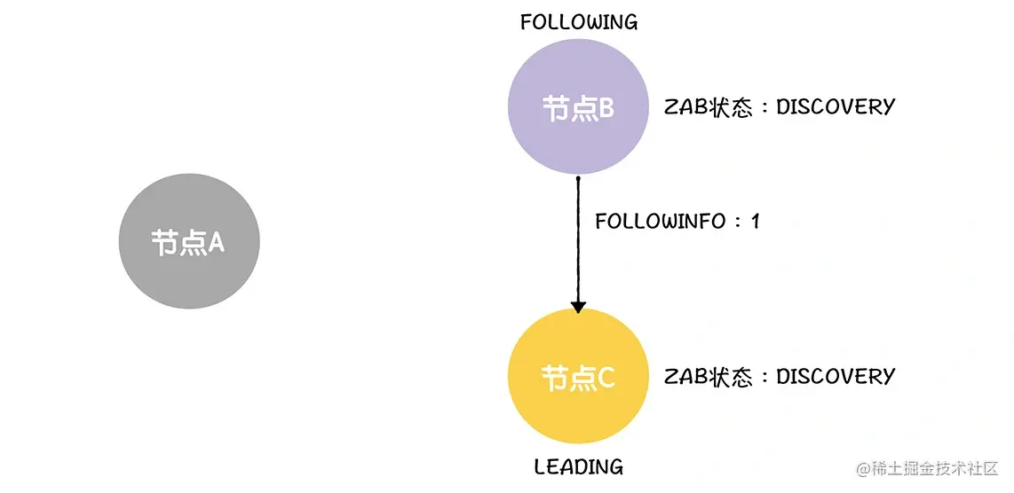 首先,B、C 会把自己的 ZAB 状态设置为成员发现(DISCOVERY),这就表明,选举(ELECTION)阶段结束了,进入了下一个阶段: