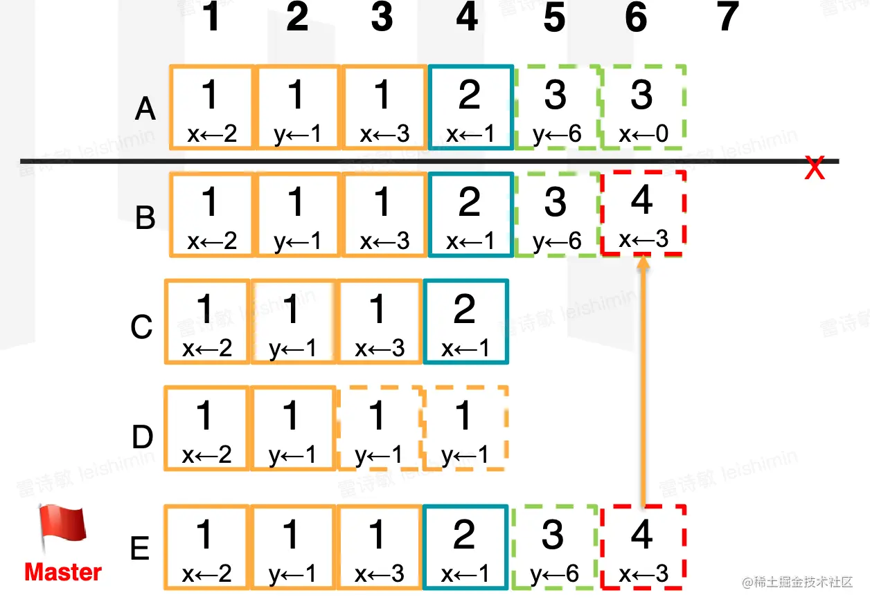 这里提交有顺序,比如先提交给B,D还未收到提交的信息,就会出现严重的不一致。怎么解决后面说。