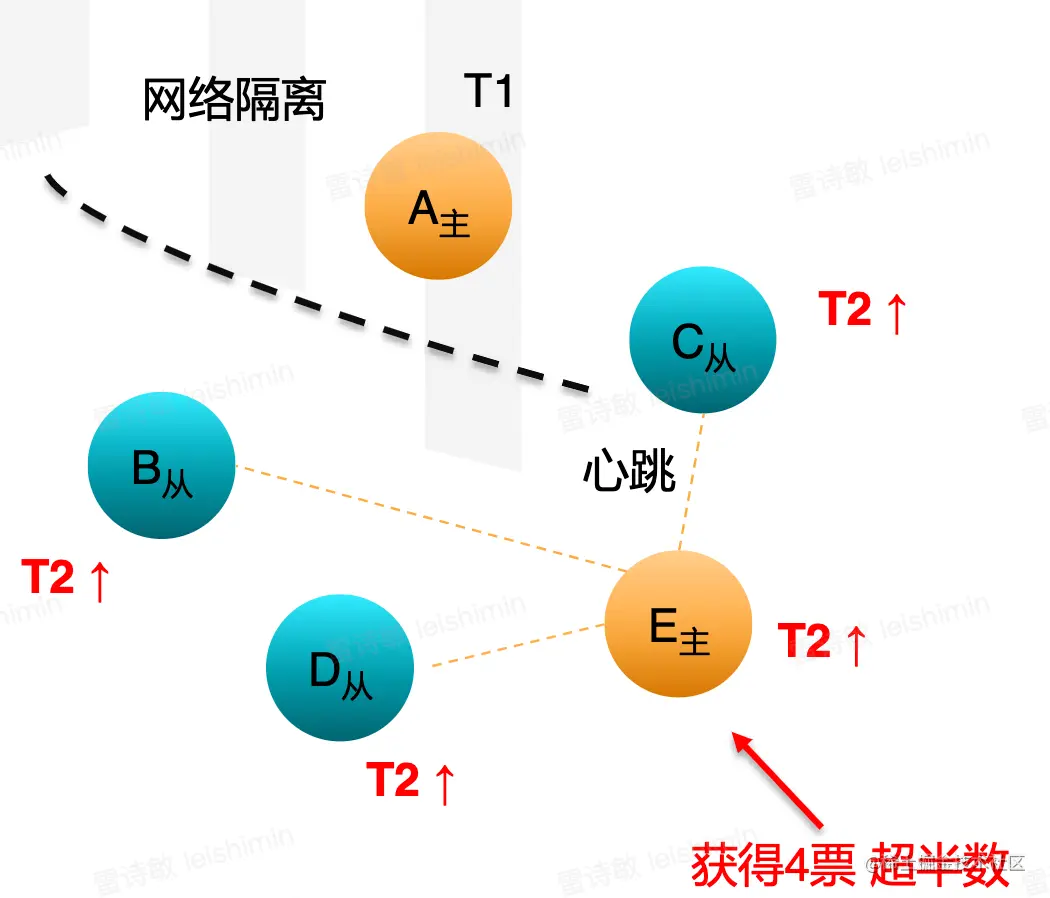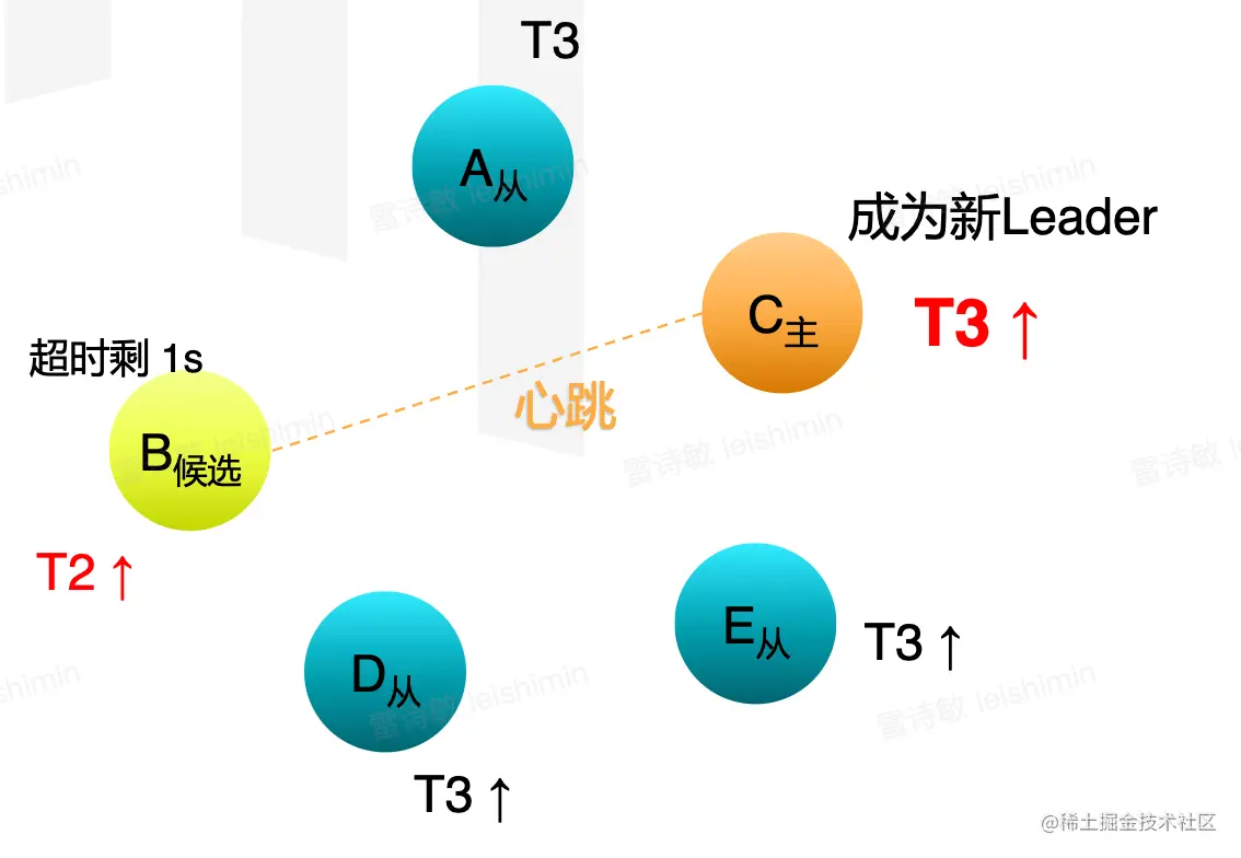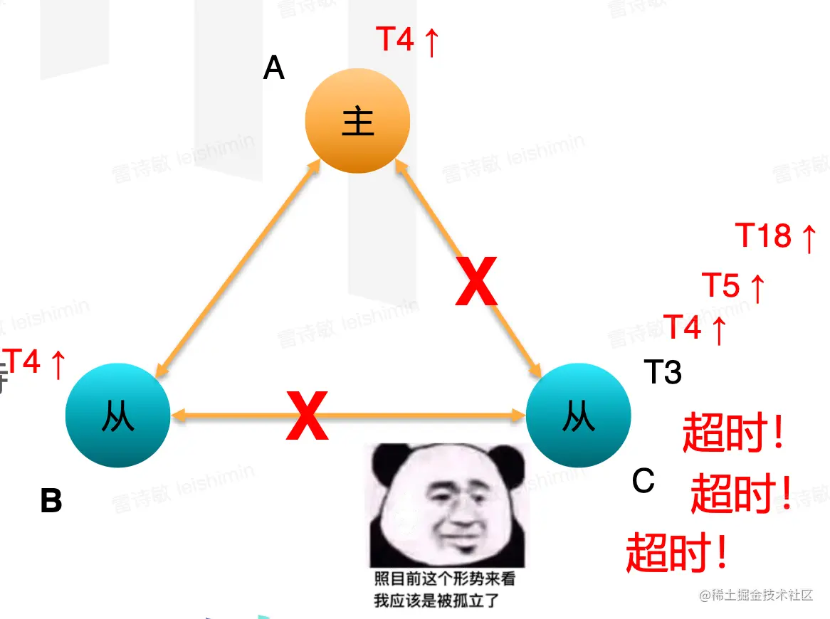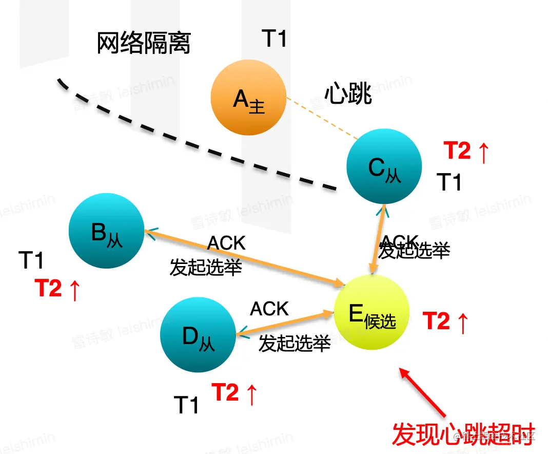 - 任何节点只要发现主节点的心跳超时,就可以认为主节点已经失效。