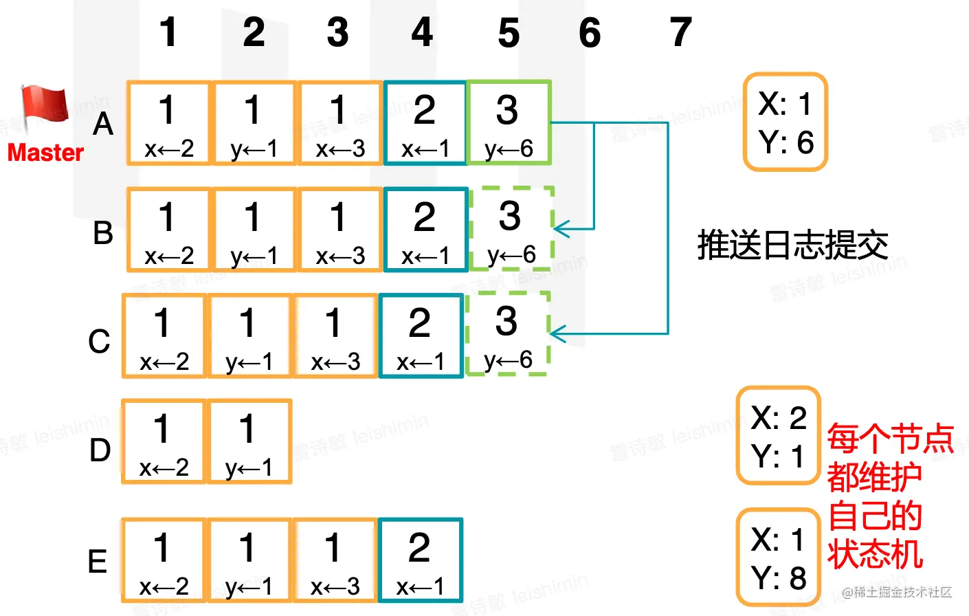 领导者以自己的数据为准,实现各节点数据副本的一致的。