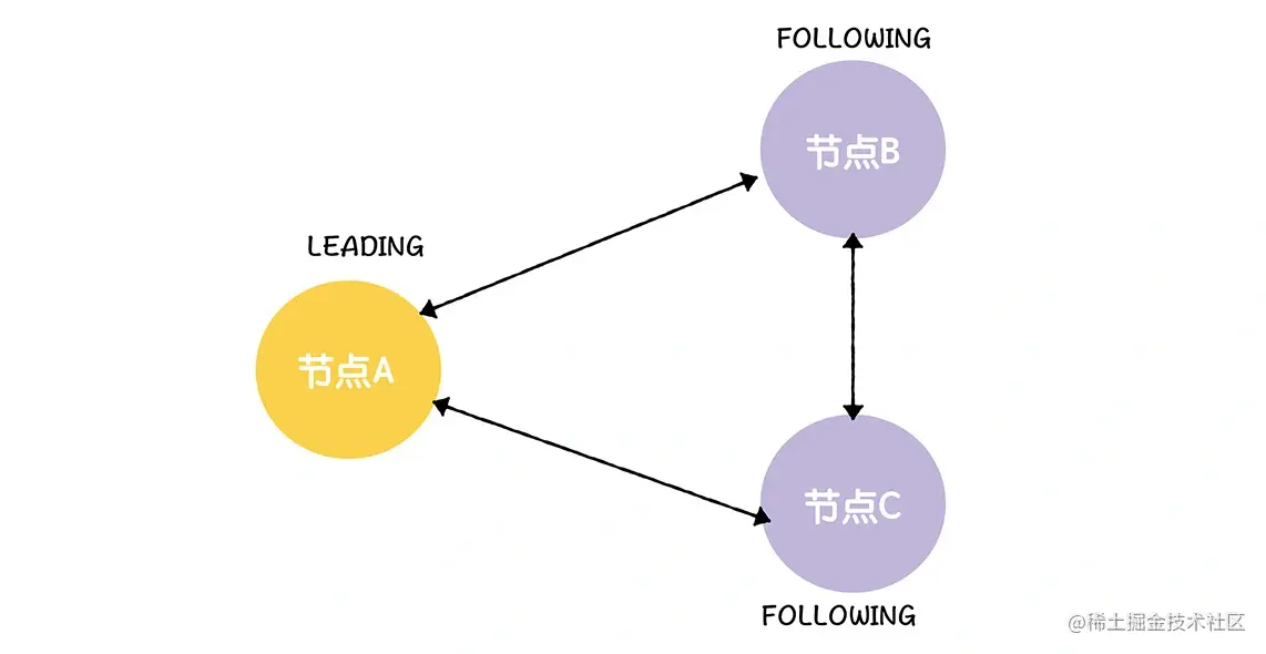 最后,因为此时节点 B、C 提议的领导者(节点 C)赢得大多数选票了(2 张选票),那么,节点 B、C 将根据投票结果,变更节点状态,并退出选举。比如,因为当选的领导者是节点 C,那么节点 B 将变更状态为 FOLLOWING,并退出选举,而节点 C 将变更状态为 LEADING,并退出选举。