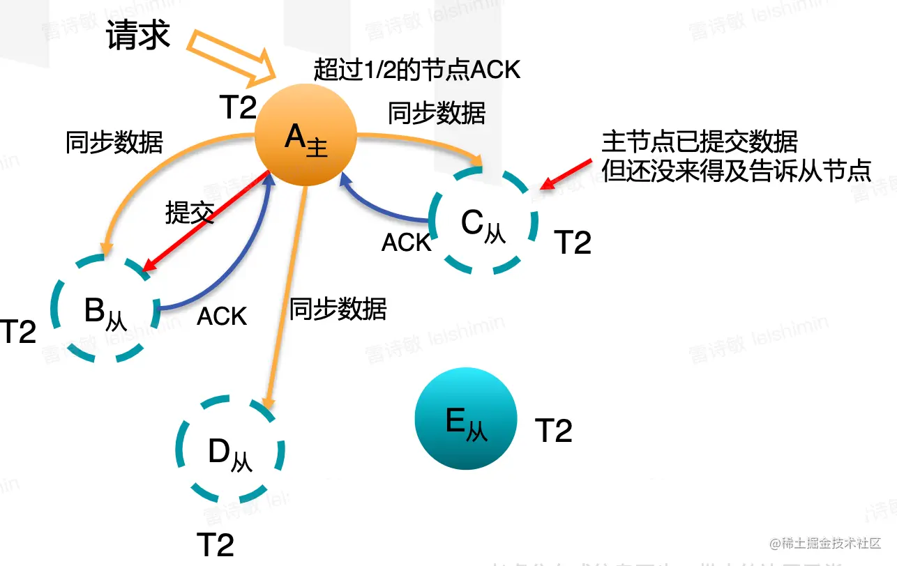 主节点收到超过1/2以上的节点ack后,确认数据安全,提交数据。