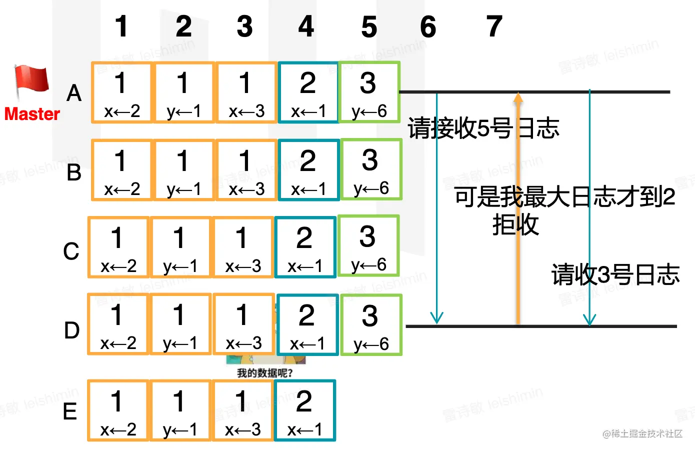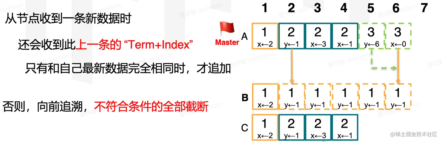 - 3说明了,如果想赢得选举,要比半数以上节点的数据新(相同)