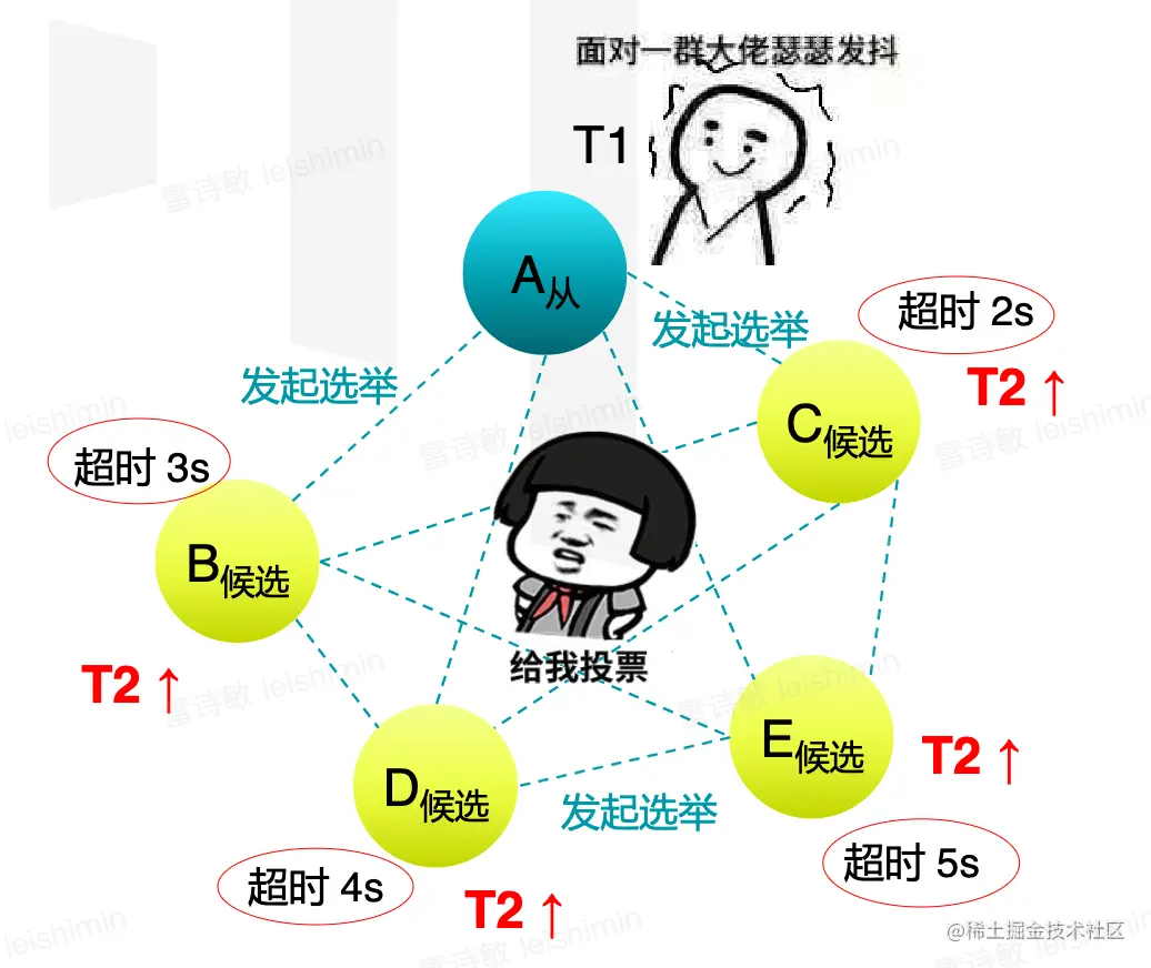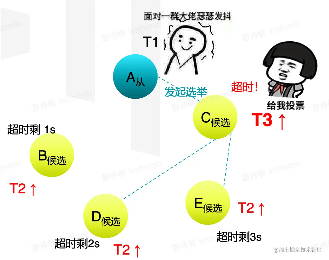 - 当某个候选人再次超时后,会把自己的任期再+1,然后发起一轮新的选举。