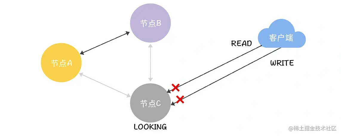 举个例子:当发生分区故障了,C 与 A(领导者)、B 网络不通了,那么 C 将设置自己的状态为 LOOKING,此时在 C 节点上既不能执行读操作,也不能执行写操作。