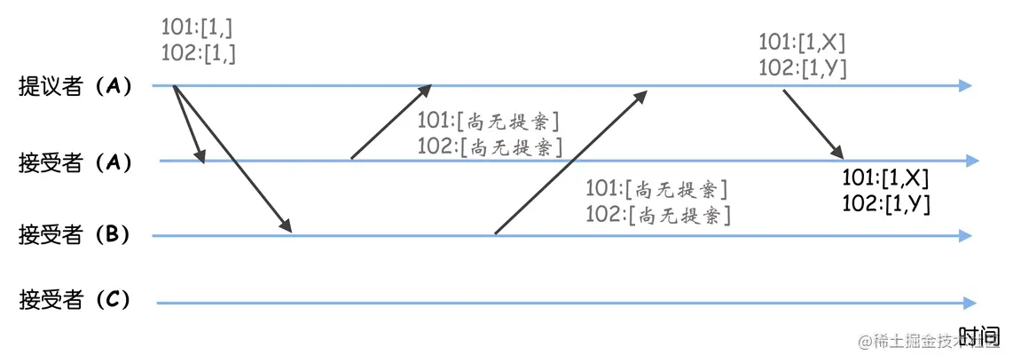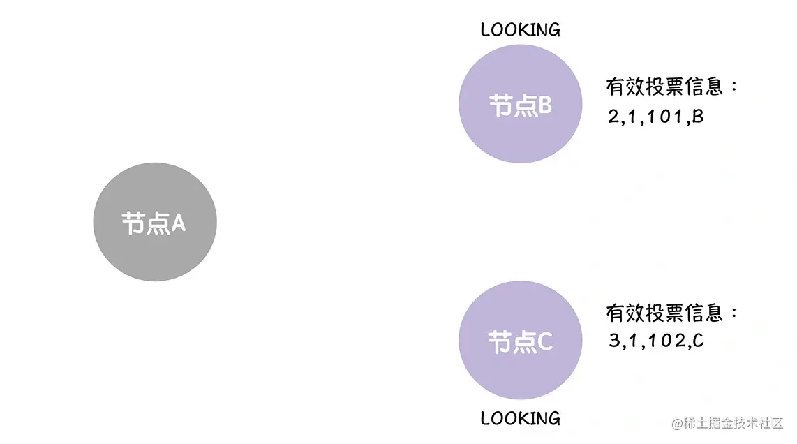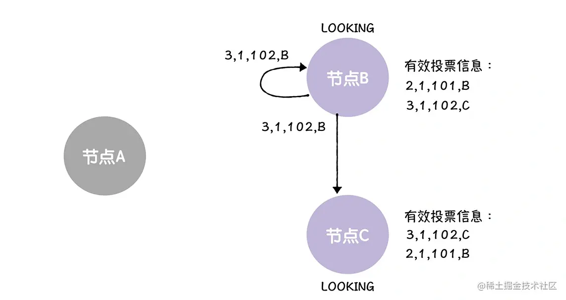 接着,当节点 B、C 接收到来自节点 B,新的选票时,因为这张选票(<3, 1, 102, B>)提议的领导者,与他们提议的领导者是一样的,都是节点 C,所以,他们正常接收和存储这张选票,就可以。