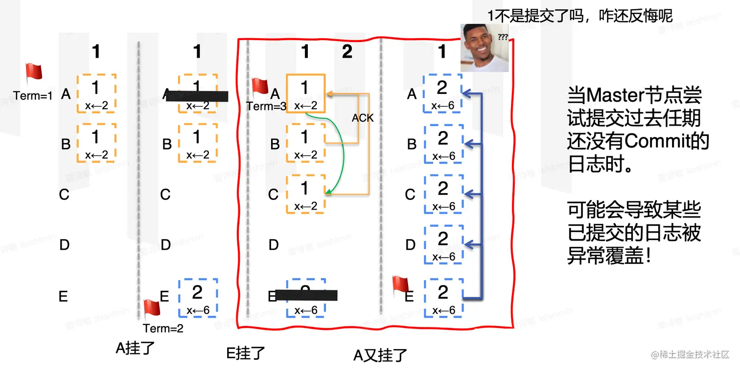 - 由于超过半数的节点已经进入新一轮的任期,旧leader不再可能获得半数以上的ack。