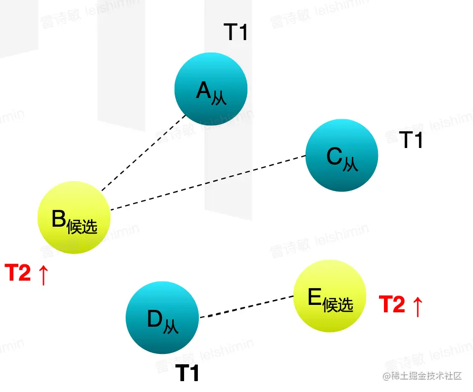 图中B节点可能发生了网络隔离,不知道A成为了新的leader,因为认可的leader的最大任期T1。