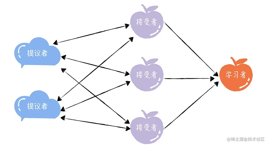 - 观察者(Observer):作为备份(Backup)节点,类似跟随者,但是没有投票权,也就是说,观察者不参与领导者选举和提案提交的投票。你可以对比着 Paxos 中的学习者来理解。