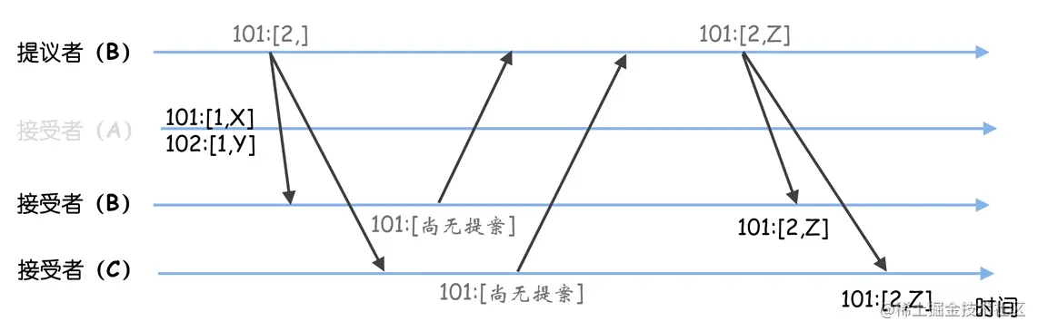 在这里,我想强调一点:B 已提交提案的最大值,也是它最新提案的最大值。因为在 ZooKeeper 实现中,节点退出跟随者状态时(也就是在进入选举前),所有未提交的提案都会被提交。这是 ZooKeeper 的设计,你知道有这么个事就可以了。