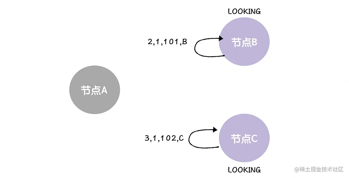 接着节点 B、C 分别接收到来自对方的选票,比如 B 接收到来自 C 的选票,C 接收到来自 B 的选票:
