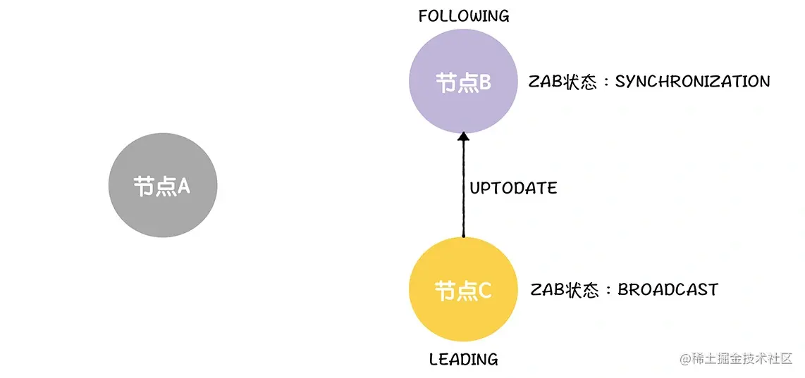 接着,当领导者接收到来自大多数节点的 NEWLEADER 消息的确认响应,将设置 ZAB 状态为广播。在这里,C 接收到 B 的确认响应,加上 C 自己,就是大多数确认了。所以,在接收到来自 B 的确认响应后,C 设置自己的 ZAB 状态为广播,并发送 UPTODATE 消息给所有跟随者,通知它们数据同步已经完成了。