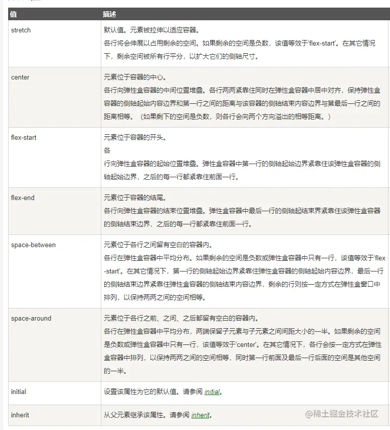 - align-content属性在弹性容器内的各项没有占用交叉轴上所有可用的空间时对齐容器内的各项(垂直) 默认值:stretch (属性值来源于菜鸟教程)