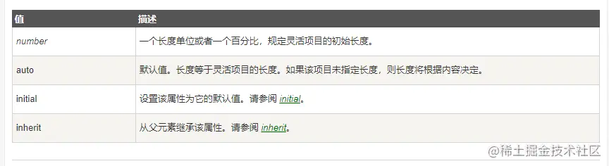- flex-basis属性定义了在分配多余空间之前,项目占据的主轴空间(main size)。浏览器根据这个属性,计算主轴是否有多余空间。默认值为auto,即项目的本来大小。(属性值来源于菜鸟教程)