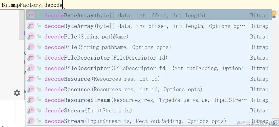 BitmapFactory.decodeByteArray();(来源:字节数组)BitmapFactory.decodeFile();(来源:文件路径)BitmapFactory.decodeResource();(来源:资源ID)BitmapFactory.decodeStream();(来源:流)