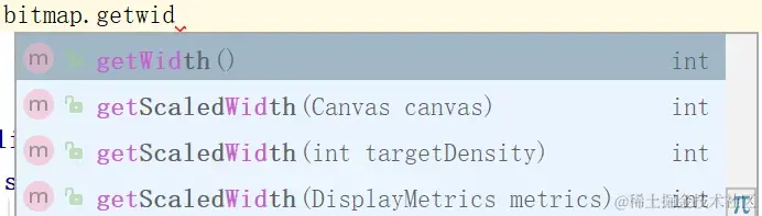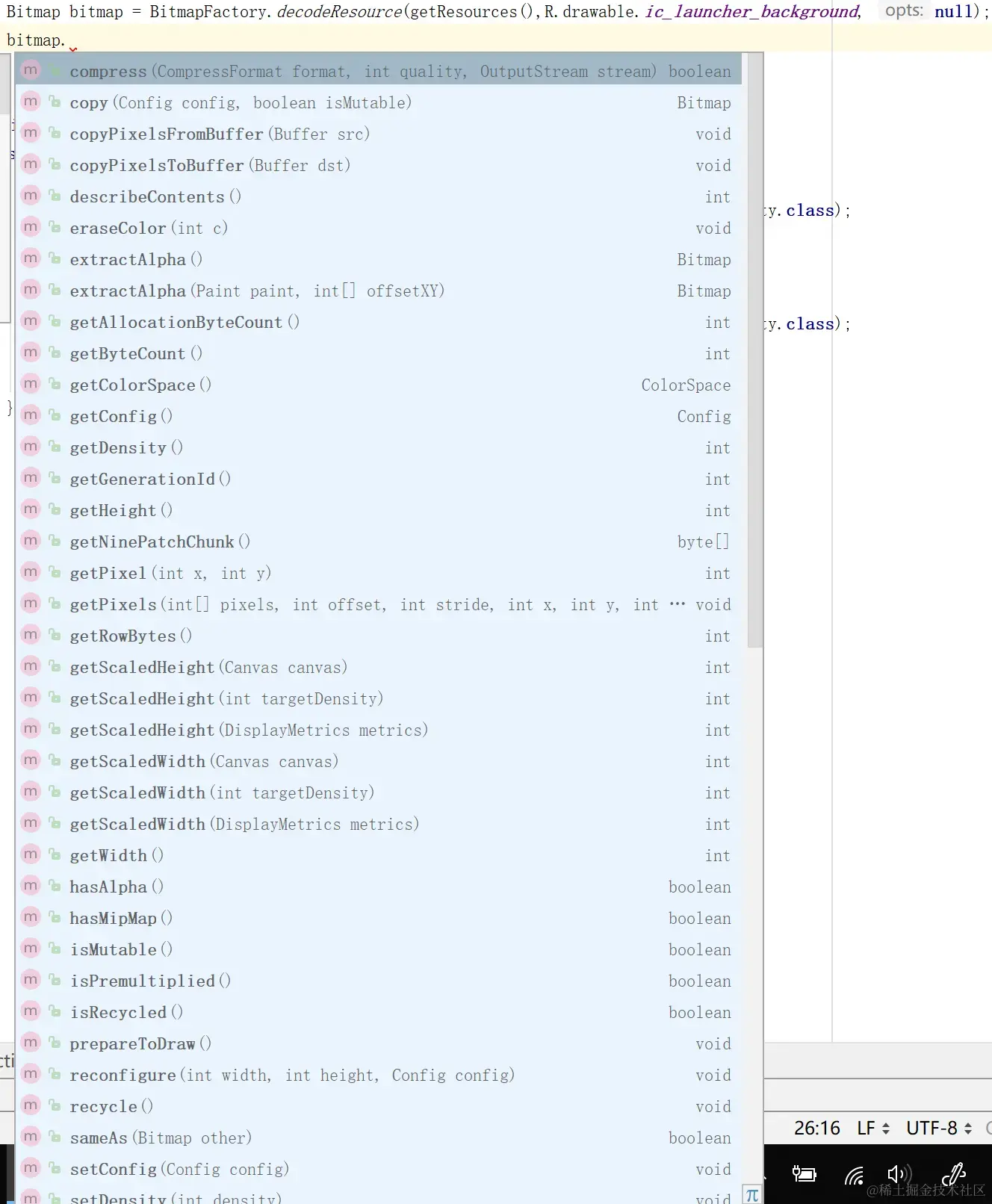 extractAlpha():取bitmap对象的α值出来单独生成一张Bitmap;compress():对bitmap进行压缩;getByteCount():获取到字节数;- 获取宽高: