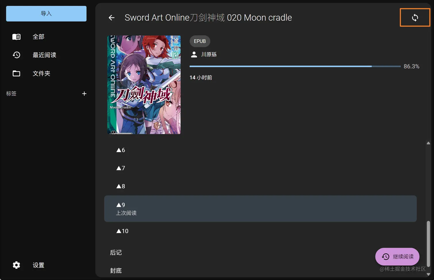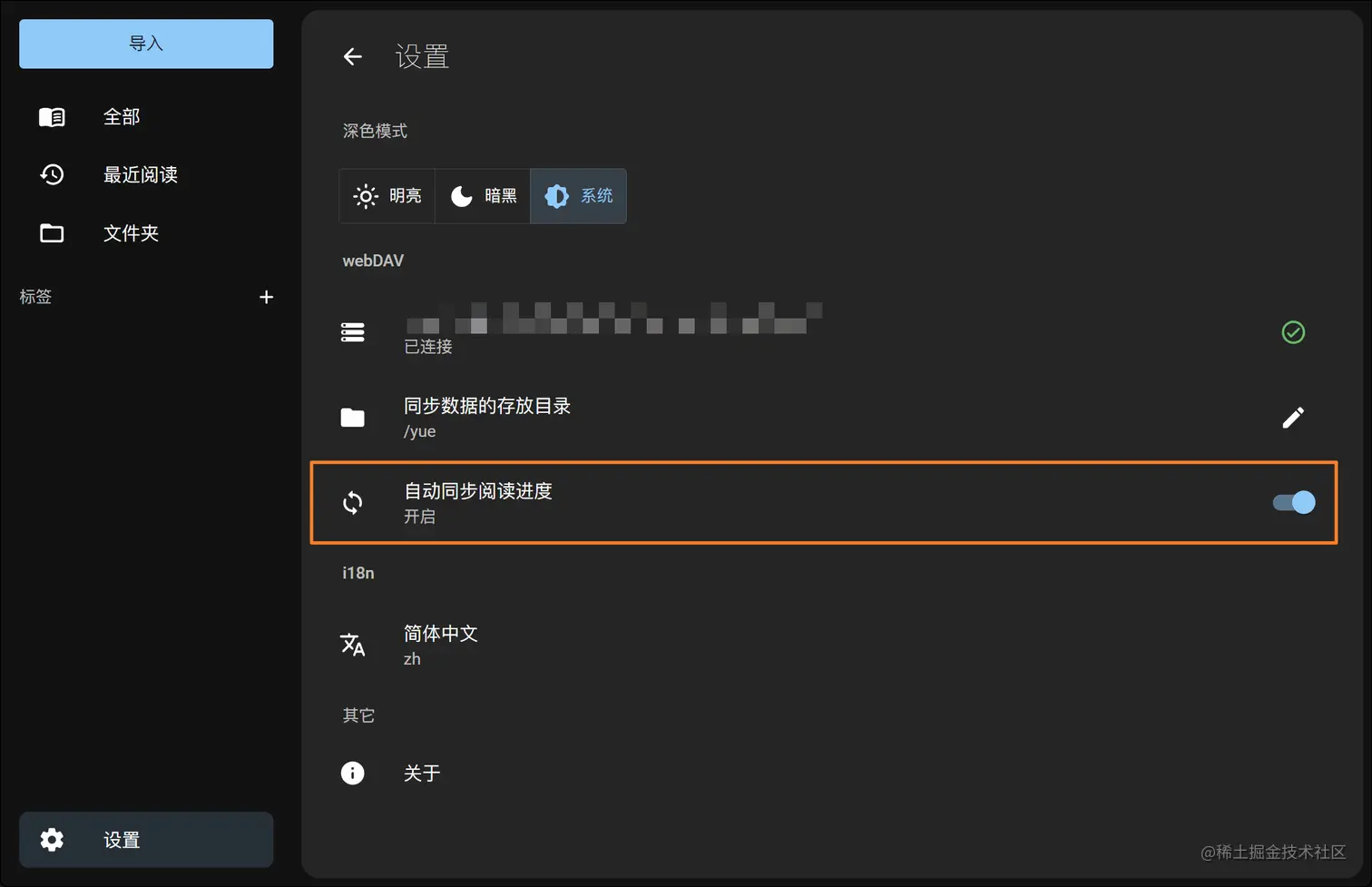 从v1.5.0版本开始,阅读器支持同步阅读进度,默认通过手动点击来同步,如果需要自动同步,可以在设置中开启