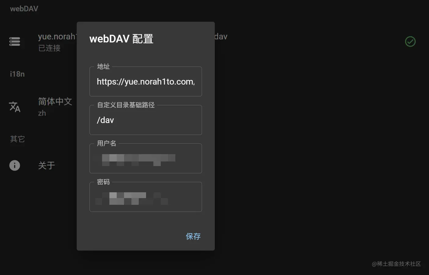 该项目的地址为 yue.norah1to.com,如果服务地址为坚果云 dav.jianguoyun.com/dav,此时我们填入 https://yue.norah1to.com/proxy/dav.jianguoyun.com/dav 即可: