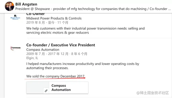 公司联合创始人之一 Bill Angsten 领英信息显示,公司早在2017年12月就被收购了。