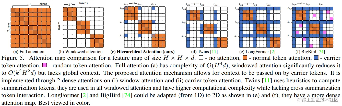 上图简单展示了高效的全局局部自注意力机制的注意力图比较。可以看出,所提出的分层注意力将自注意力分为局部和子全局部分,都可以压缩为两个密集的注意力操作。