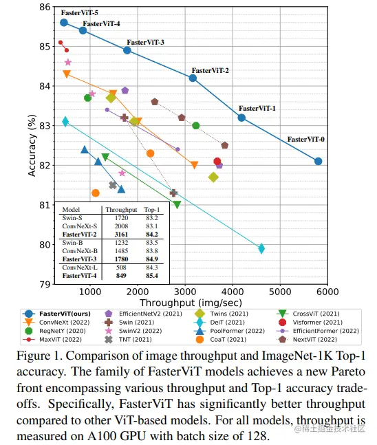 在ImageNet-1K数据集上,与各种混合、卷积和基于Transformer的网络相比,FasterViT模型在相同吞吐量下实现了更高的准确性。例如,与ConvNeXt-T相比,准确率提高了2.2%。考虑到准确性和吞吐量的权衡,FasterViT模型比基于Transformer的模型(如Swin Transformer系列)具有显著的速度优势。此外,与最近的EfficientFormer和MaxViT等混合模型相比,FasterViT在平均吞吐量上具有更高的性能,并且在ImageNet top-1性能方面表现更好。在模型优化方面,如TensorRT,FasterViT模型的延迟-准确性Pareto前沿趋势依然存在。 :::