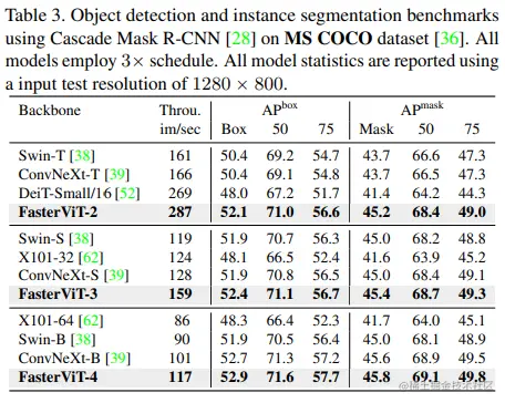 在MS COCO数据集上,使用Cascade Mask R-CNN网络进行目标检测和实例分割的性能评估中,FasterViT模型在准确性和吞吐量的权衡上表现更好。例如,FasterViT-4在盒子AP指标上优于ConvNeXt-B和Swin-B,分别提升了0.2和1.0,在掩膜AP指标上分别提升了0.3和1.0,同时吞吐量分别快了15%和30%。在其他模型变体中也观察到类似的趋势。此外,使用FasterViT-4作为ImageNet-21K预训练的骨干网络,与最先进的DINO模型进行额外的目标检测实验,达到了58.7的盒子AP,验证了FasterViT作为骨干网络与更复杂、最先进的模型的有效性。