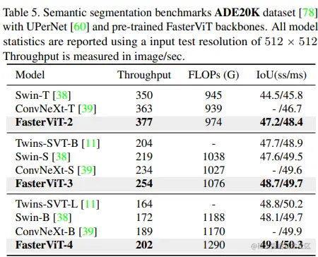 在 ADE20K 数据集上,使用 UPerNet 网络进行语义分割实验,FasterViT 模型也在性能和吞吐量的权衡上取得了良好的表现。例如,FasterViT-4 在 mIoU 指标上优于 Swin-B,单尺度和多尺度推理分别提高了1.0和0.7,并且吞吐量高出16.94%。与 ConvNeXt-B 相比,在多尺度推理方面,FasterViT-4的吞吐量照样提高了7.01%,mIoU提高了0.4。