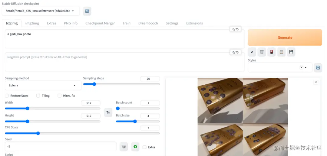 如下图所示,我用 5 张巧克力盒子作为输入,训练了一个名为 godi_box 的物体,只要在 Prompt 中使用这个关键词,他就会在场景中生成这个盒子。