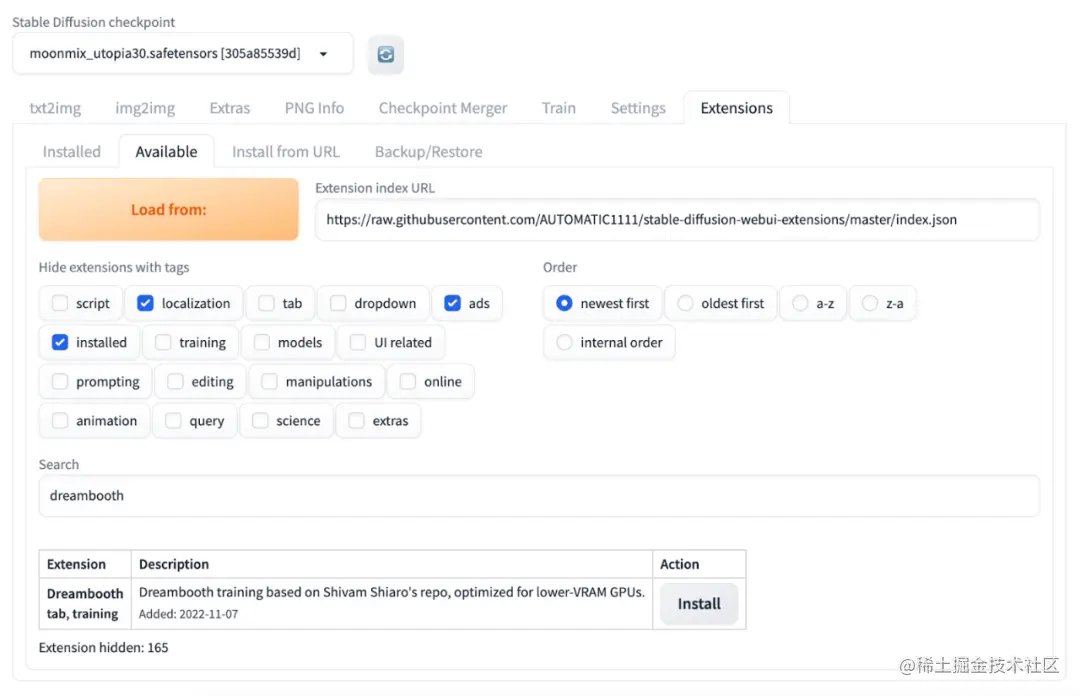 Stable Diffusion web UI 默认没有安装 DreamBooth 扩展,需要在 extensions 中搜索并安装。