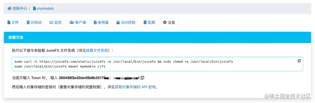 了解了保存模型的目录结构,接下来就可以把 JuiceFS 文件系统挂载到模型目录了,回到 JuiceFS 官网控制台,打开文件系统的“设置”选项卡,如下图所示。
