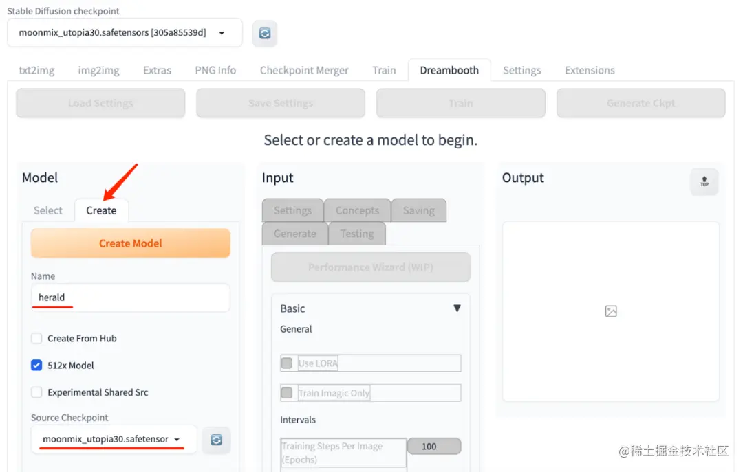 初次用 DreamBooth 微调,需要先创建一个新模型,如下图所示,输入新模型的名称,并选择基础模型。创建新模型需要一定的时间,具体取决于硬件配置。