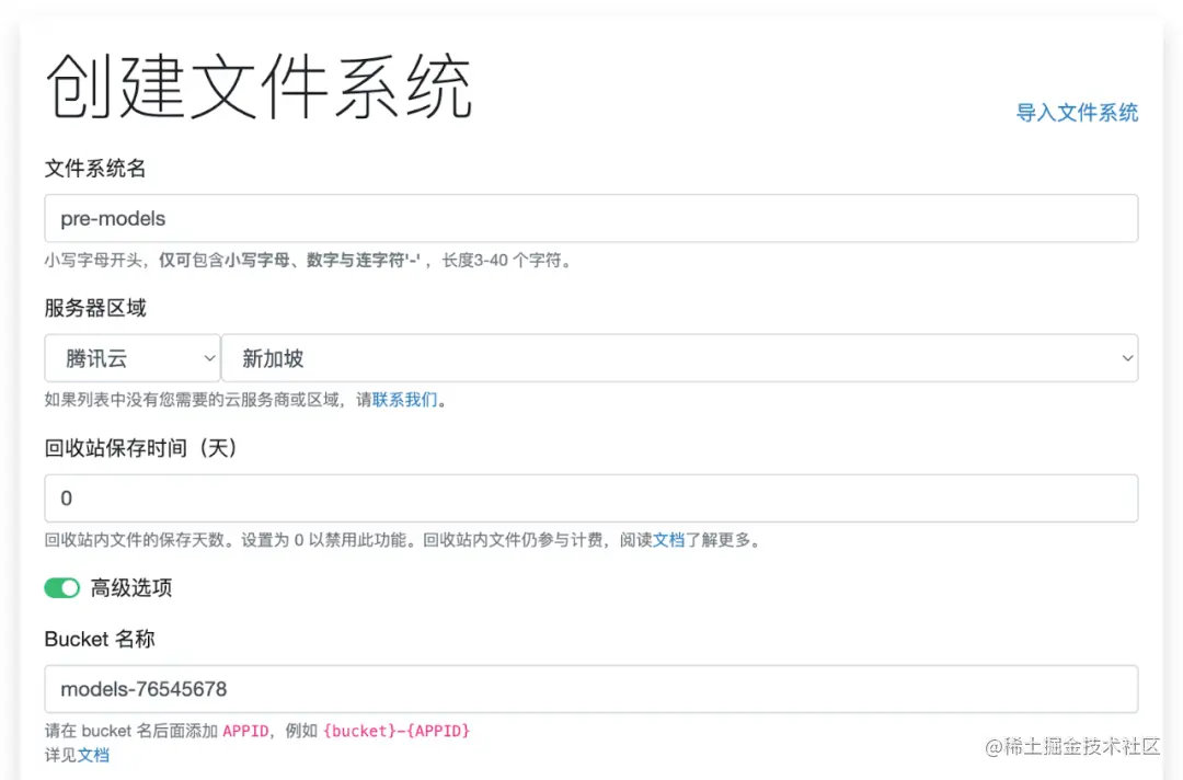- 文件系统名称:根据格式要求设置,名称需要平台唯一;