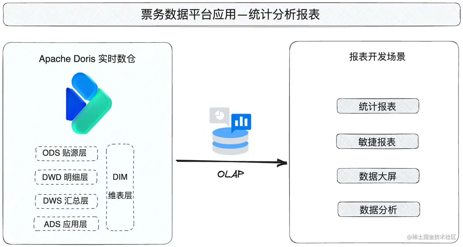 作为剧院票务的管理后台,票务数据平台主要利用 Apache Doris 进行报表开发,提供所需数据分析,以帮助业务人员对票务进行管理,提高票务销量。针对不同的报表场景,业务分析的侧重点有所不同,主要体现在: