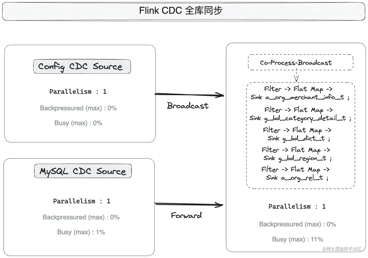- 利用 Flink,在 Job 任务中创建两个 CDC 捕获任务。其中一个数据流负责捕获变更数据,另一个广播流负责进行更新配置。