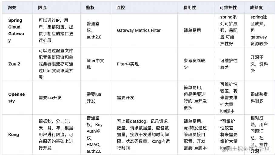 网关之间的对比如下图: