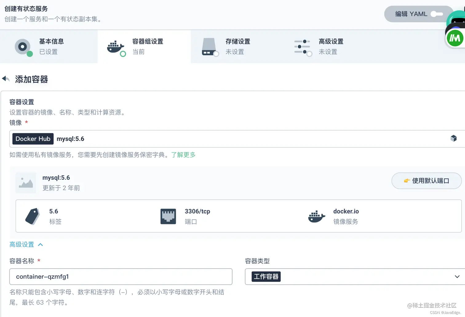 mysql:5.6,按下回车键,然后点击使用默认端口。由于配置还未设置完成,请不要点击右下角的 √ 按钮。点击这里,可继续编辑: