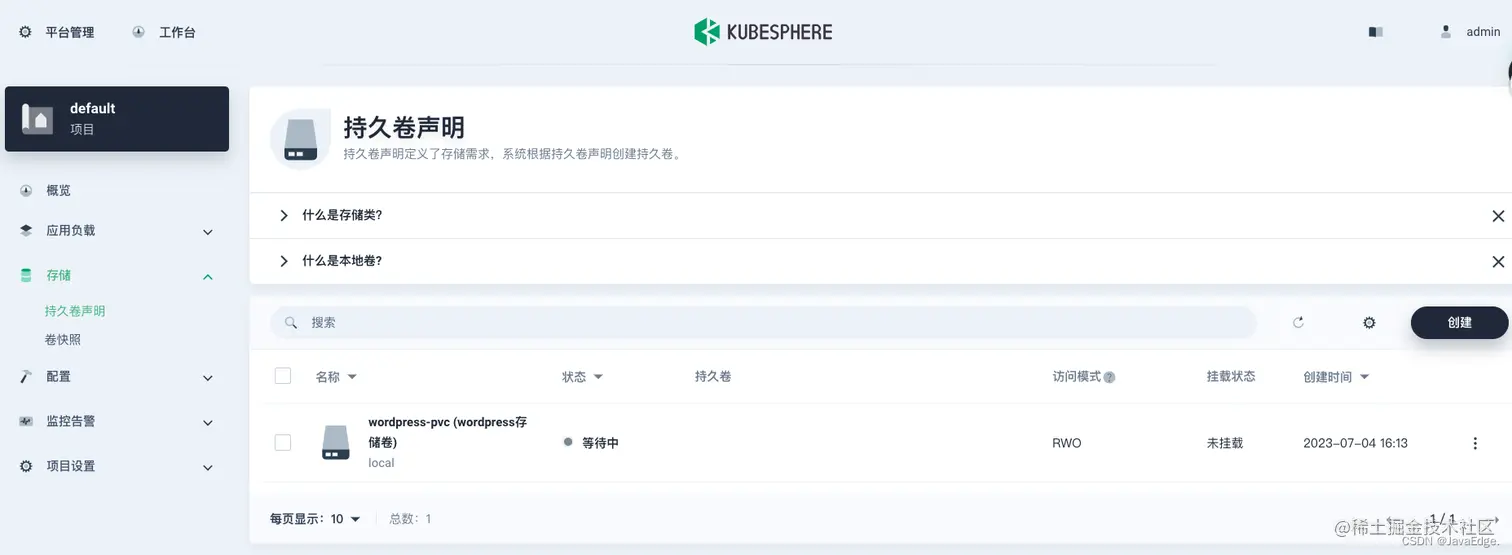 - 访问存储下的持久卷声明,点击创建。