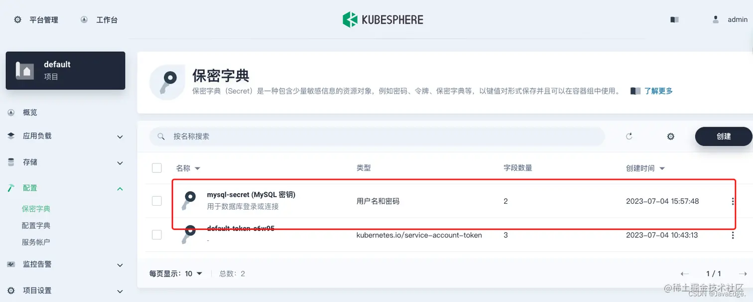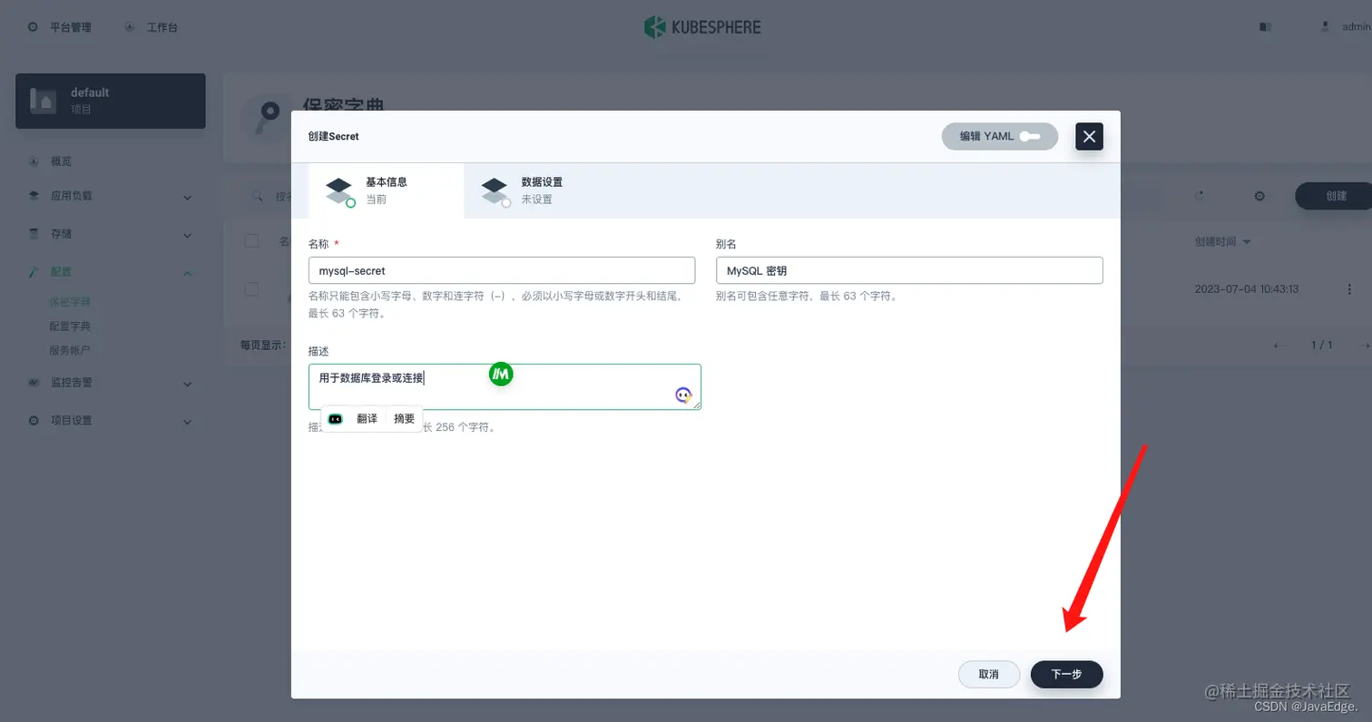 project-regular帐户登录 KubeSphere 控制台,访问demo-project的详情页并导航到配置。在保密字典中,点击右侧的创建。 - 输入基本信息(例如,将其命名为