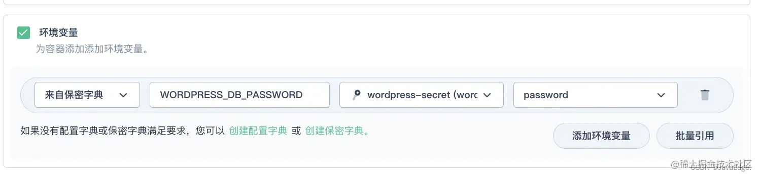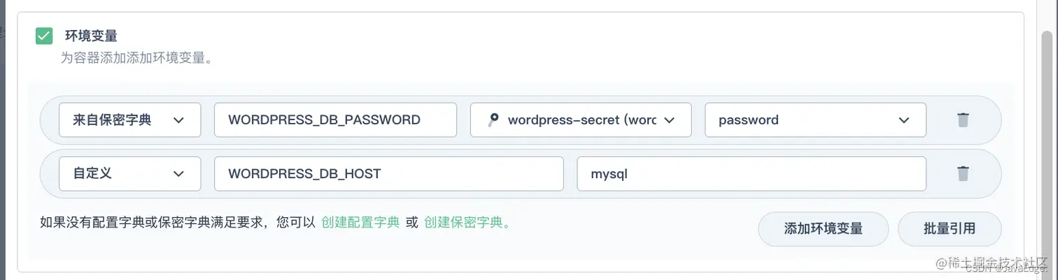 WORDPRESS_DB_PASSWORD,请选择在步骤 1 中创建的wordpress-secret和WORDPRESS_DB_PASSWORD。 - 点击添加环境变量,分别输入